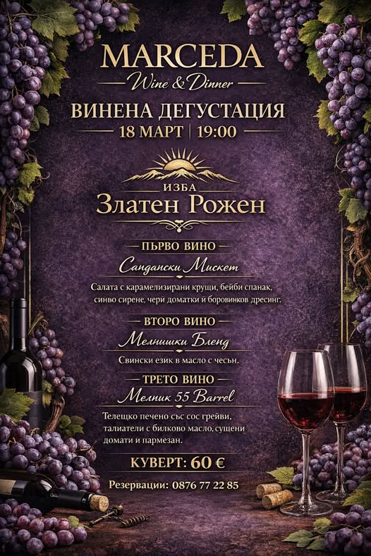 Очаква ви специална вечер, посветена на вината на изба Златен Рожен, съчетани с внимателно подбрано гурме меню.